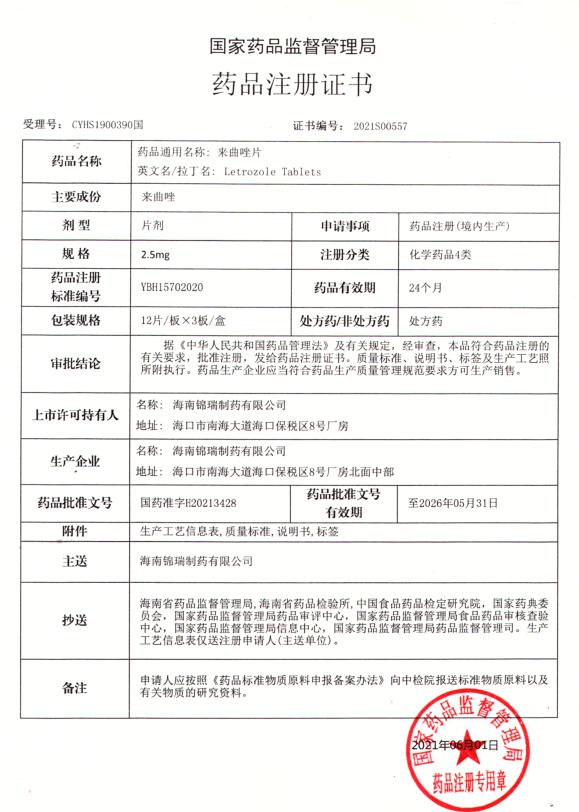 2021年06月,海南锦瑞制药收到国家药品监督管理局颁发的《来曲瞠片药品注册证书》,这意味着海南锦瑞来曲只唑片( 2. 5mg)产品获得国家相关部门批准,具备了批量生产条件。